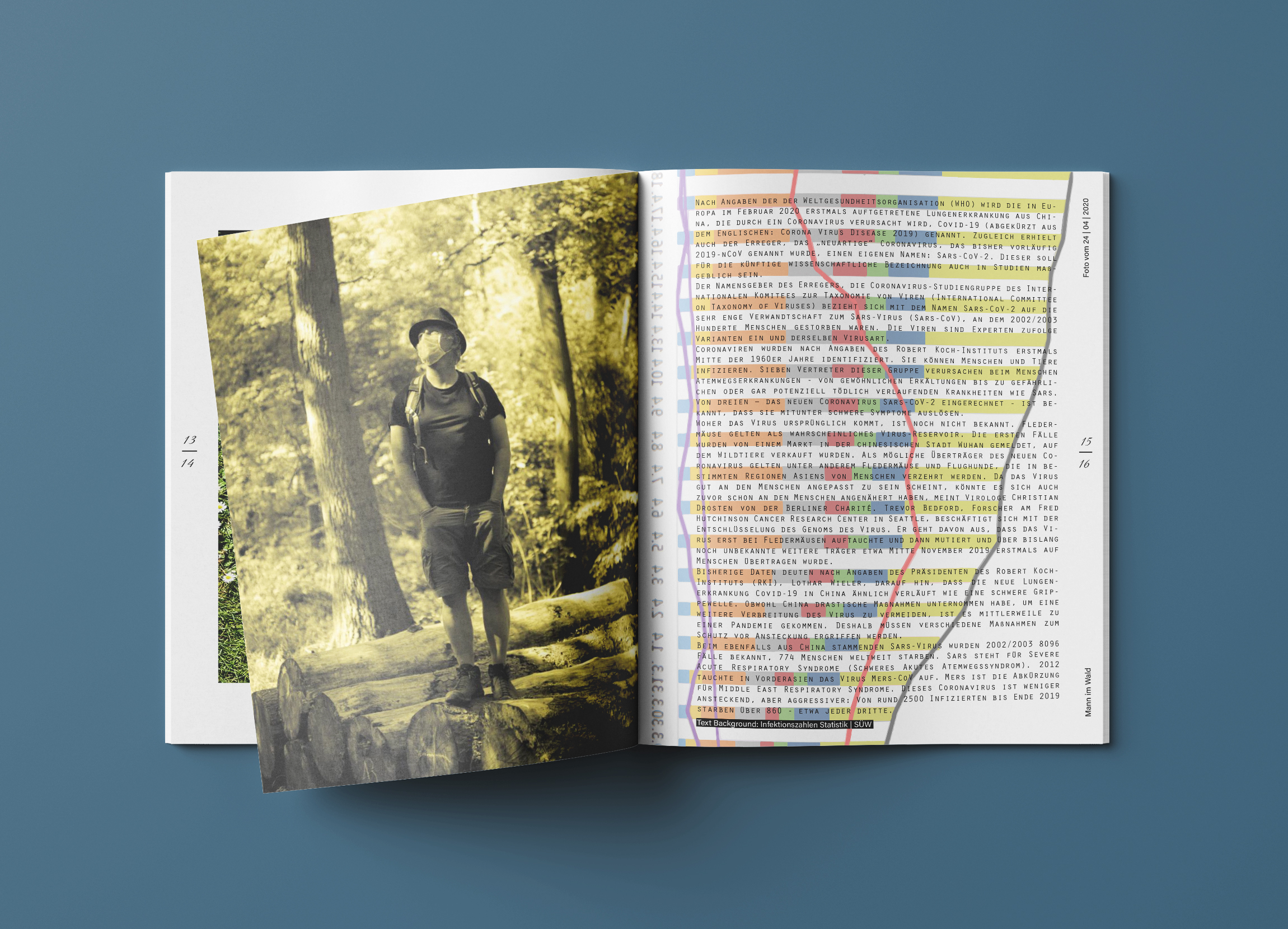 Um den Aspekt der Differenz zu verdeutlichen, habe ich die „ernsten“ Maskenporträts in grellen, poppigen und fröhlichen Farben eingefärbt. Gleichgesetzt habe ich diese entweder mit altdeutschen Gedichten aus der Romantik oder mit abstrahierten Corona Diagrammen aus Zeitungsartikeln. Zudem habe ich Fotografien von Abstandshaltern und Absperrungen gemacht und diesen Fotos aus der intakten Natur gegenübergestellt. Abbilder der verstörenden Wirklichkeit in konfrontativen Bildpaaren.